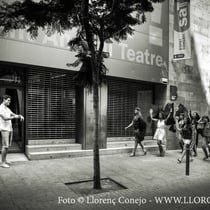 Conversaciones y complicidades de las bailarinas esperando que abran las puestas del teatro SAT, Sant Andreu Teatre, en el carrer, Neopatria, 54. Para los últimos ensayos antes del estreno de INSTINTO